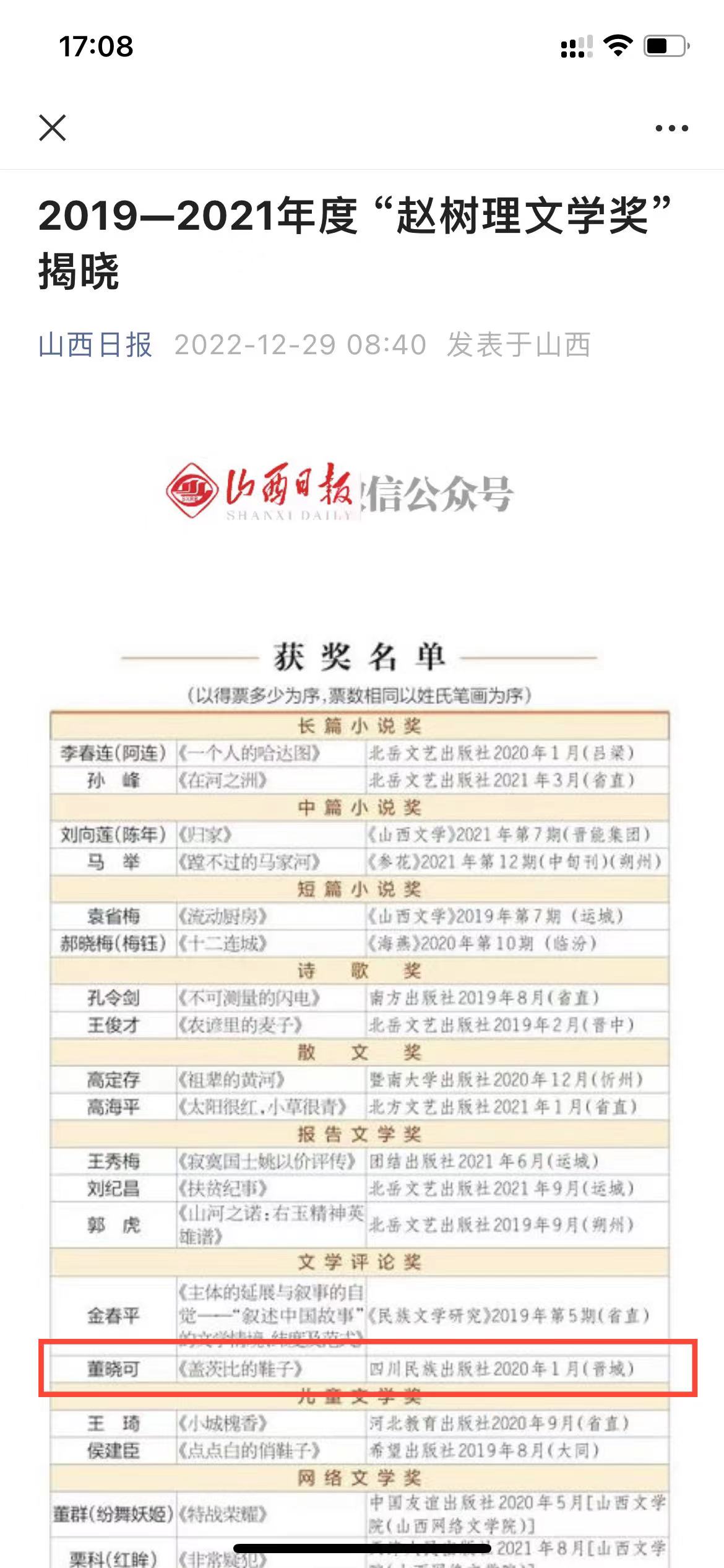 12月13日,“赵树理文学奖”终评评审会召开,评选出11类奖项,19部(篇)获奖作品,4位获奖者。其中,长篇小说奖2部、中篇小说奖2篇、短篇小说奖2篇、诗歌奖2部、散文奖2部、报告文学奖3部、文学评论奖2部(篇)、儿童文学奖2部、网络文学奖2部。文学新人奖2人,优秀编辑奖2人。其中,best365官网董晓可的《盖茨比的鞋子》获2019-2021年度“赵树理文学奖”文学评论奖。