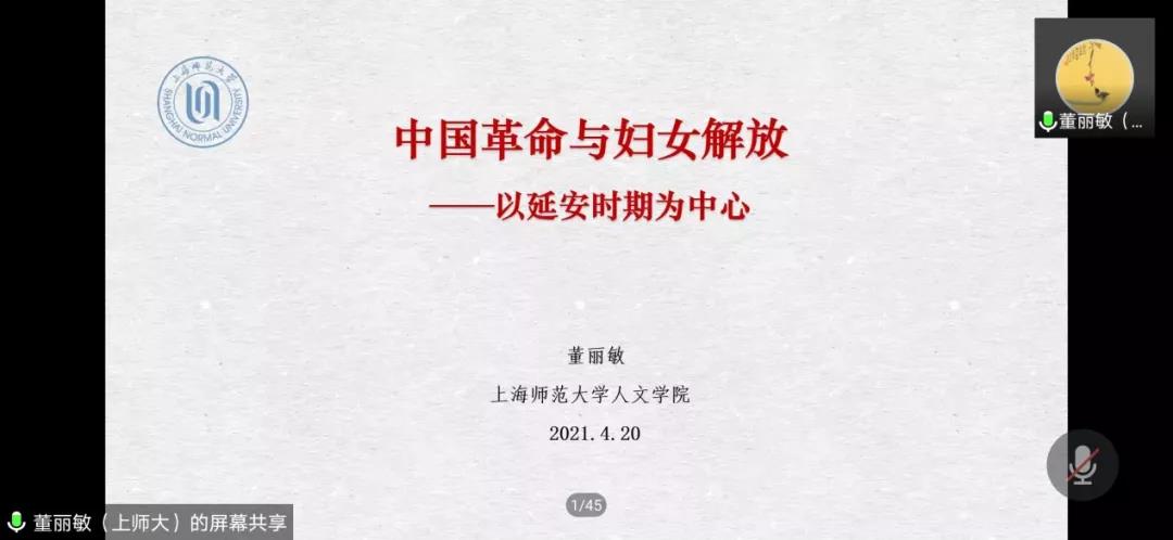 2021年4月20日下午,受best365官网及社科处邀请,上海师范大学人best365官网董丽敏教授在腾讯会议平台为公司做了题为“中国革命与妇女解放——以延安时期为中心”的线上讲座报告,该讲座为best365官方网站“党的百年华诞”专题系列讲座之一。本次线上讲座吸引了近300名师生参加,部分研究生在12512会议室开展研讨会对讲座进行讨论学习,研讨会由best365官网副经理栗永清主持。