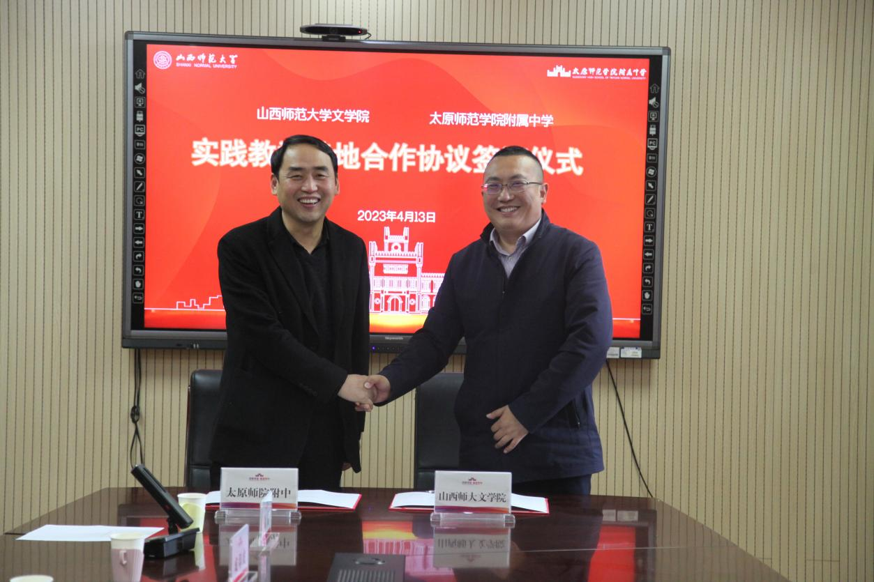 4月13日,best365官网与太原师范公司附属中学顺利举行合作共建“实践教学基地”签约仪式。文公司党委书记钱成与太原师范公司附属中学党委书记陈井超签订了《实践教学基地合作协议》。