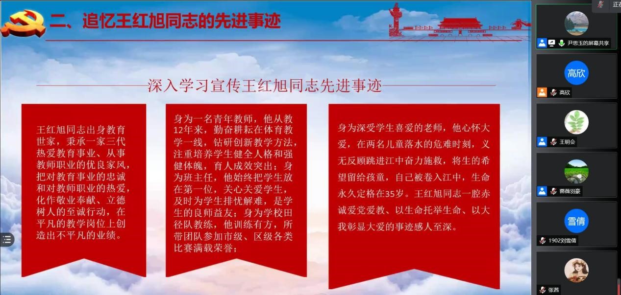 9月26日,汉语言文学员工党支部在线上对王红旭同志的先进事迹进行了集体学习,会议由支部书记侯昕昊主持。侯昕昊简要介绍了王红旭同志的事迹,组织支部同志观看视频:《用生命托举希望·2021感动重庆特别奖发布会》,让支部同志更直观地感受王红旭同志的心怀大爱、无私奉献的高尚精神。