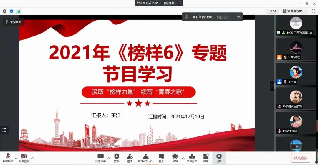 王永青在总结发言中讲道以下两点:一是党紧紧依靠人民,创造性地完成社会主义改造,在我国确立了社会主义基本制度;随后又带领人民发愤图强,掀起建设社会主义热潮,开始了沿着社会主义道路实现中华民族伟大复兴的历史征程。全体同志要认真学习每一个历史阶段,以史为鉴。二是《榜样六》重点聚焦“七一勋章”获得者和全国“两优一先”表彰对象典型事迹,榜样们如稳稳屹立的灯塔,护航新时代的巍巍巨轮,在实现第二个百年奋斗目标、实现中华民族伟大复兴中国梦的新征程上,扬帆远航。我们要向他们学习,在祖国需要的地方奉献力量。