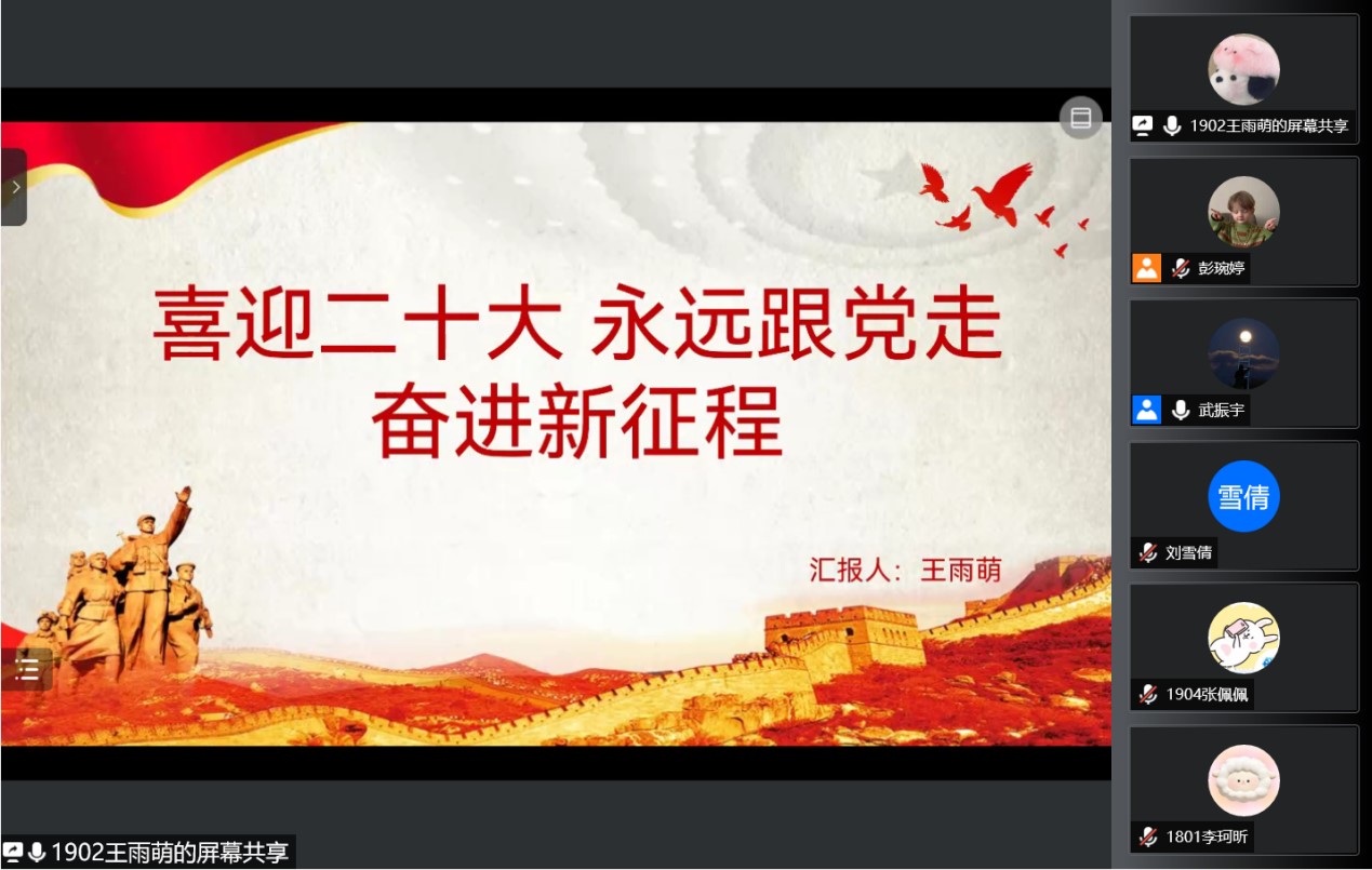 4月16日,best365官网“学雷锋,送温暖”小组员工党支部在腾讯会议开展“喜迎二十大、永远跟党走、奋进新征程”主题党日活动。会议由支部副书记武振宇主持,支部全体党员和积极分子参加。员工党员王雨萌同志担任主讲人。