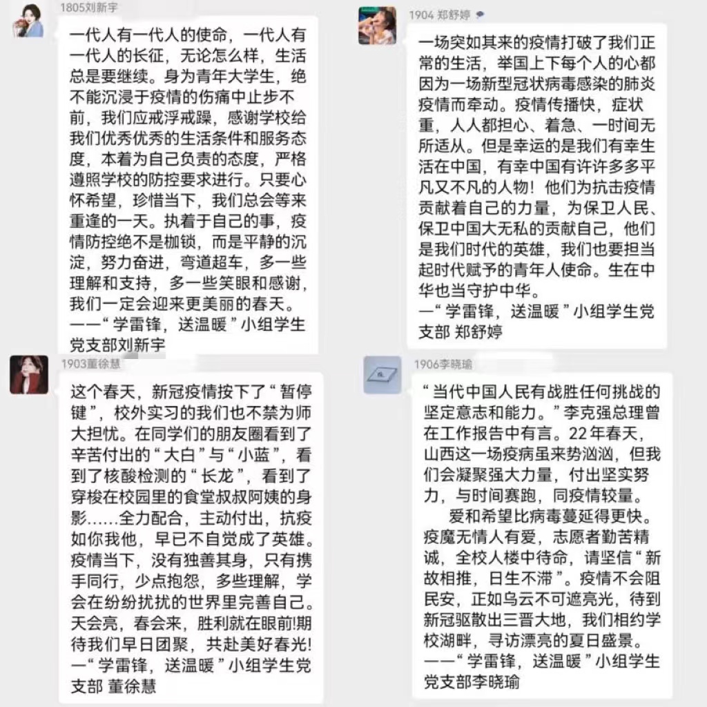 李波沄讲到:“一代人有一代人的使命,一代人有一代人的担当,我们能做的或许就是做好自己力所能及的事情,或许就是在困难面前勇往直前,或许就是在配合国家的过程中完善自己。”张文超发表感悟:“太阳下山了,夜有星空,也会有灯打开,你看这世界也不坏。你永远可以相信我们的老师与志愿者,凌晨有他们安排工作的身影,清晨有他们送来早饭的脚步,傍晚还有他们鼓舞人心的话语,而我们所要做的便是严格遵守公司疫情防控要求,戴好口罩,严守一米线,坚持不聚集,互相帮助,共克时艰。”