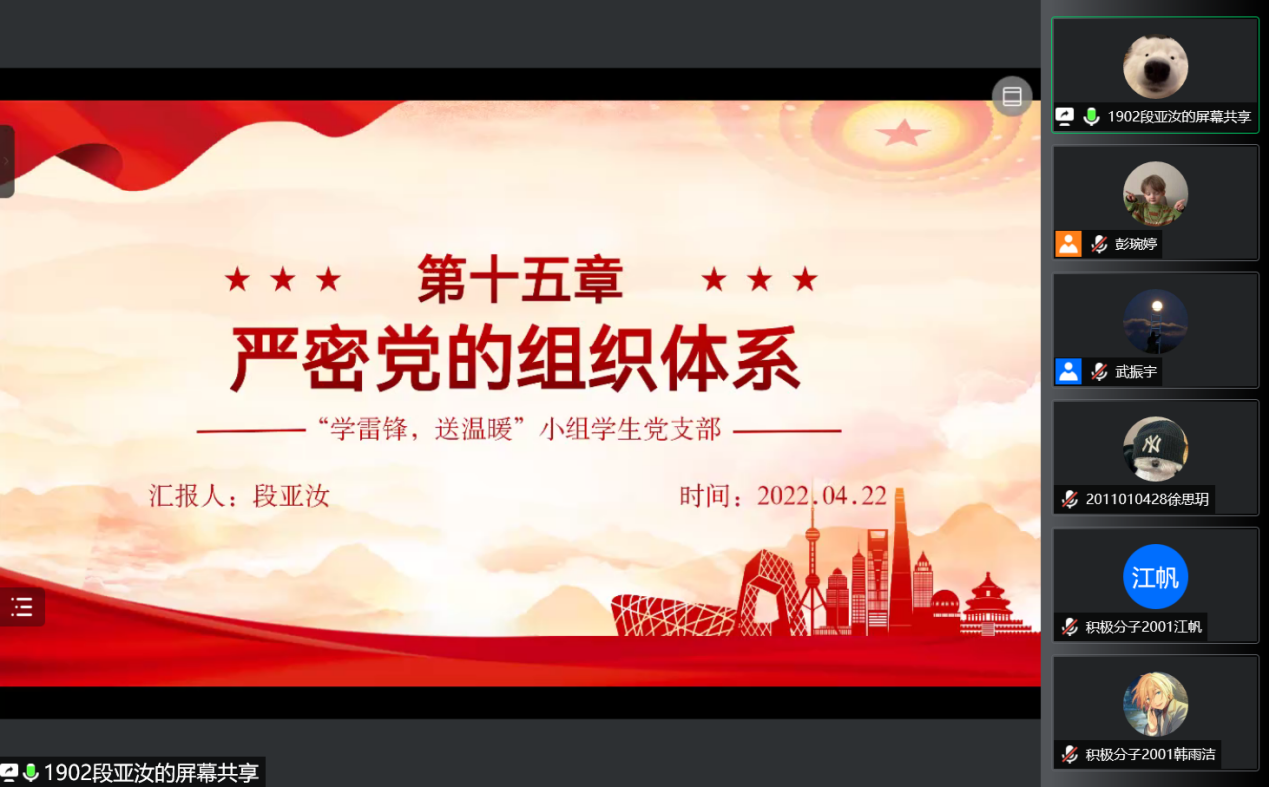 4月22日,best365官网“学雷锋,送温暖”小组员工党支部在腾讯会议学习山西干部在线平台视频与《中国共产党组织建设一百年》第十五章专题学习。活动由支部副书记武振宇主持,支部全体党员和入党积极分子参加。员工党员段亚汝同志担任主讲人。