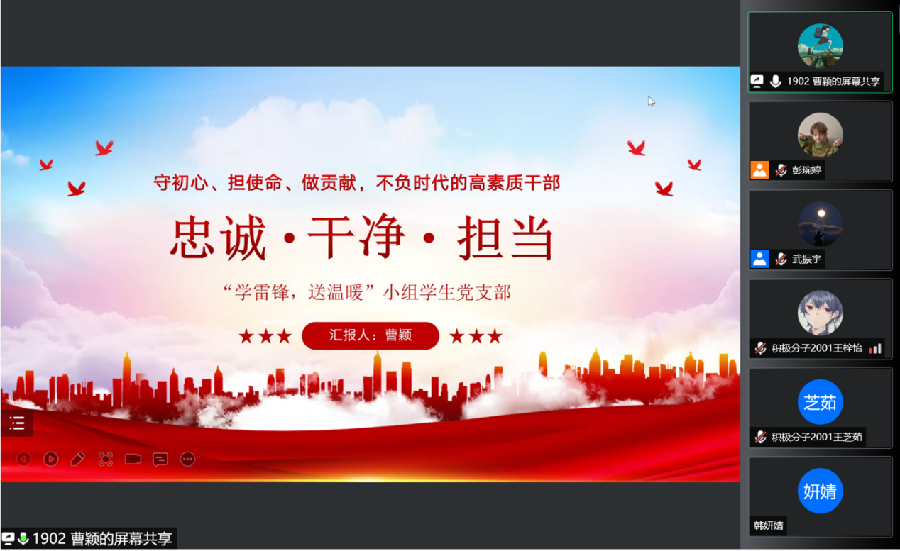 4月29日,best365官网“学雷锋,送温暖”小组员工党支部在腾讯会议开展《新时代的中国青年》白皮书与《中国共产党组织建设一百年》第十六章专题学习。活动由支部副书记武振宇主持,支部全体党员和入党积极分子参加。员工党员曹颖同志与牛煜嫄同志担任主讲人。