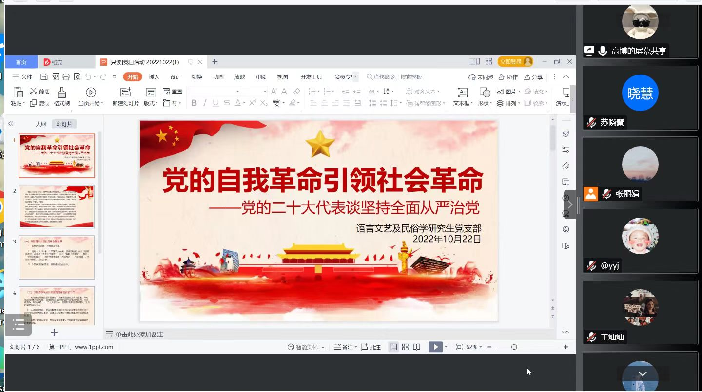 10月22日下午19点,语言文艺及民俗学研究生党支部在线上召开会议,深入学习关于党的自我革命引领社会革命的主要内容。本次会议由张丽娟主持,全体党员参加。