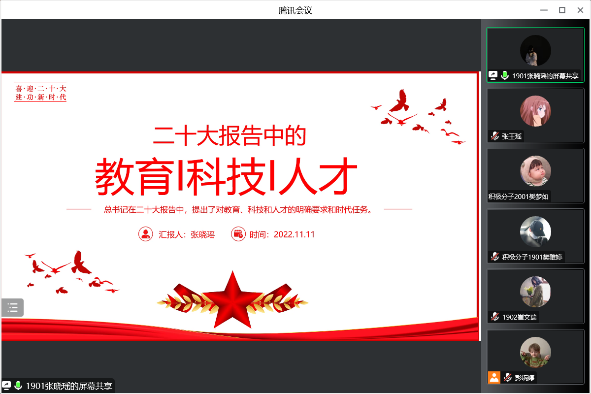 张晓瑶以党的二十大报告中的新观点、新论断、新思想为切入点,从“深刻理解教育、科技、人才是全面建设社会主义现代化国家基础性、战略性制成的根本定位”“科技是第一生产力、人才是第一资源、创新是第一动力的战略布局”“坚持教育优先发展、科技自立自强、人才引领驱动的前进路径、办好人民满意的教育的实践要求”“以更强烈的历史主动精神筑牢国家强盛之基”四个方面详细叙述了党的二十大精神。她以教育、科技、人才为维度,图文并茂地讲述了党的二十大精神要领,带领同志们认识到:我们要做有理想、敢担当、能吃苦、肯奋斗的新时代好青年,让青春在全面建设社会主义现代化国家的火热实践中绽放绚丽之花。