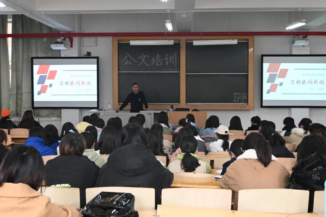 郭豪杰以“写好校园新闻”为题,从什么是新闻、新闻写作的要求、校园新闻的分类、其他应用文写作及新媒体运营五个方面展开讲解。他通过提问导向的方式与同学们进行互动,引出新闻是“欲知应知而未知”的消息”这一观点。以国家时事、校园新闻等的具体稿件为例,郭豪杰重点讲解了新闻标题与导语写作的多种方法,强调新闻不仅要注重时效性,也要紧抓创造性和生动性。当谈到新媒体运营工作时,他指出,缺少与读者的互动不利于拓展运营思路与模式,挖掘读者的需求应该是平台推广的重点。