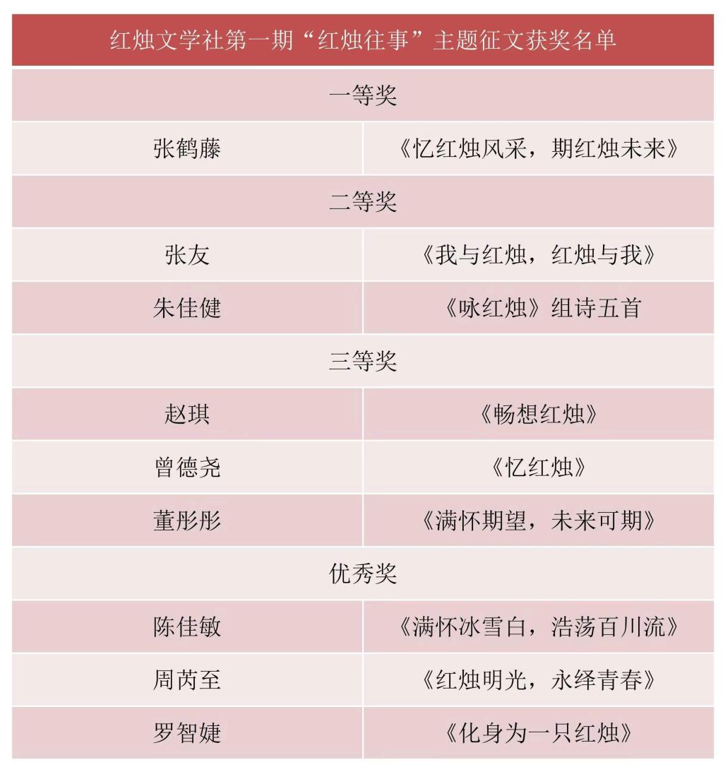 临近红烛文学社四十周年庆典,红烛文学社特开展“红烛往事”主题征文活动,50余名同学参与投稿,经严格审核,共评选出一等奖1名,二等奖2名,三等奖3名与优秀奖6名。第二期征文活动将在下学期举办,期待烛子们的参与!