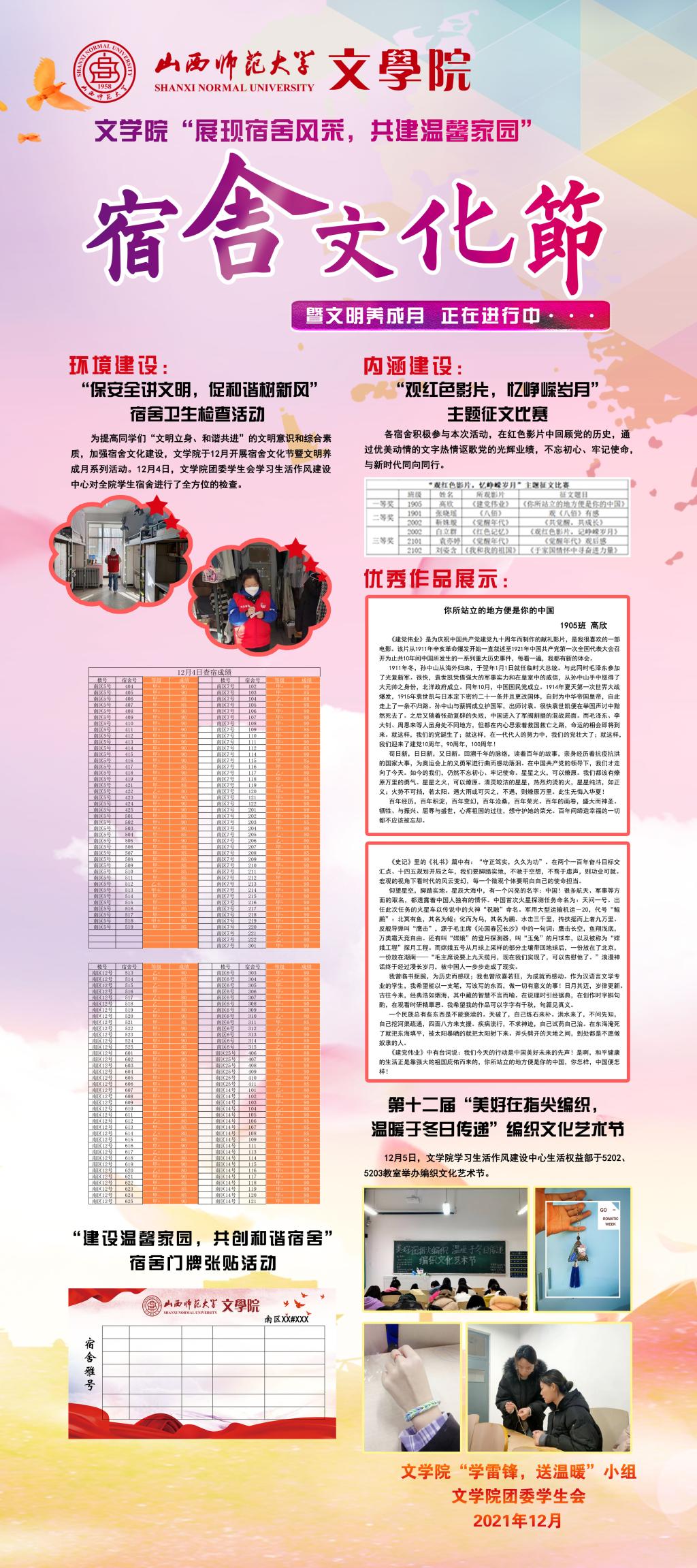 为提高同学们“文明立身、和谐共进”的文明意识和综合素质,加强宿舍文化建设,best365官网于12月开展宿舍文化节暨文明养成月系列活动。在文明养成月系列活动之“观红色影片,忆峥嵘岁月”主题征文比赛中,共收到员工参赛作品238份,经层层评审,共评选出6份获奖作品。其中,一等奖作品《你所站立的地方便是你的中国》已刊于2号楼门口的展板。