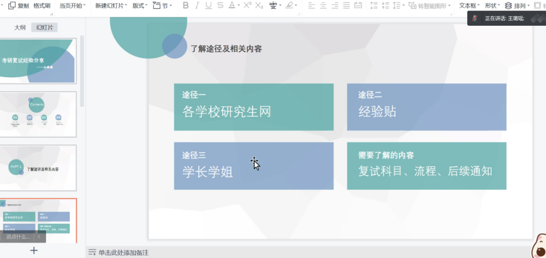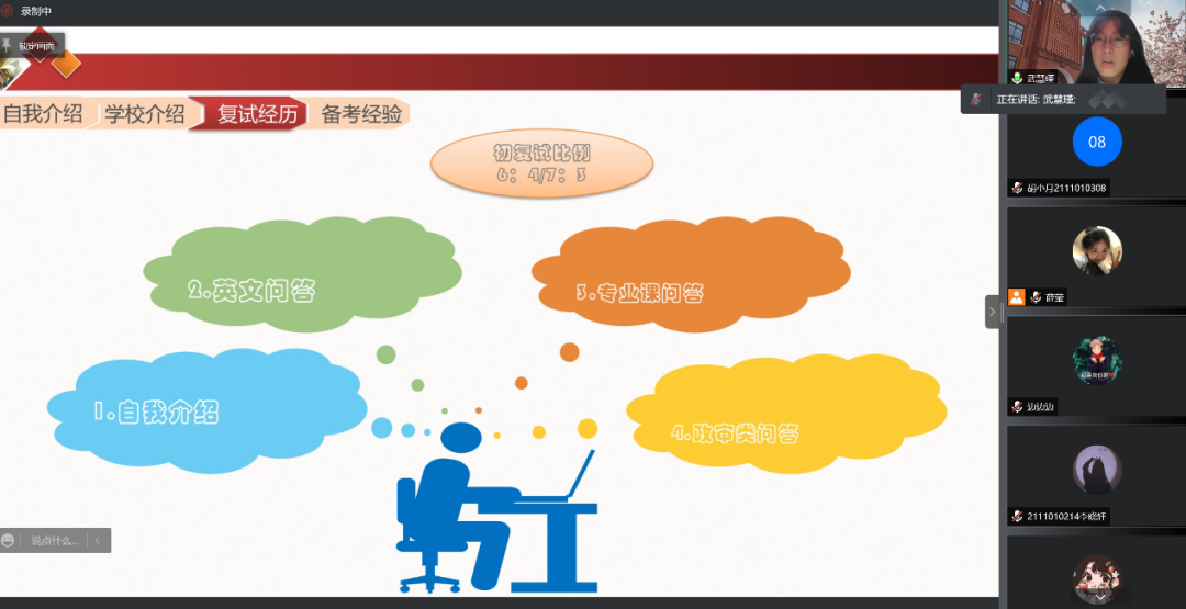 学姐们以独具个人特色的自我介绍开讲,活跃了分享会的气氛。李珂鑫学姐围绕“为什么要复试”“如何准备复试”等问题做了详细地讲解。吴和晋学姐就考研复试的重要性发表了自己的见解,她认为,考研复试一方面是为了对自己的考研初试成绩有一个更好的答复,另一方面是为了提升自身的专业水平,为自己的未来争取另一个机会和出路,让自己能够在自己热爱的领域发光发热。