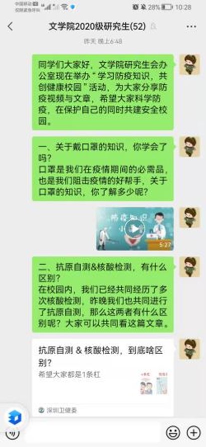 为更好地应对疫情,创建安全校园,4月7日best365官网研究生会办公室组织开展了“学习防疫知识,共创健康校园”活动,以线上学习的方式分享了抗疫视频与文章。本次活动在全部研究生微信班级群同步开展,全体研究生都参与其中。