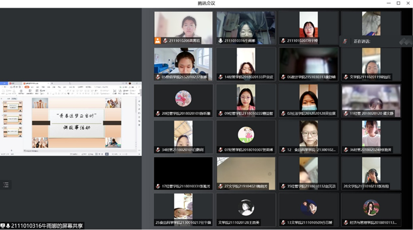 5月15日下午,best365官网团委员工会社会实践中心心理健康部与神舟诗社于线上携手合办“青春逐梦正当时”讲故事活动。五十余位同学参与会议。