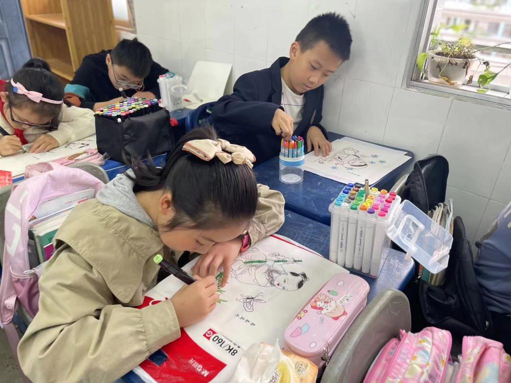 在与孩子们合照后,高老师动情地说:“孩子们灿烂的笑容深深印刻在了我的脑海,整堂课的气氛欢快,他们的年画作品,都各具特色,充满了童趣,令我深受感染。”