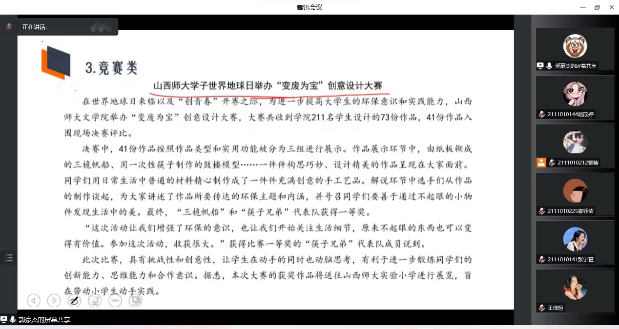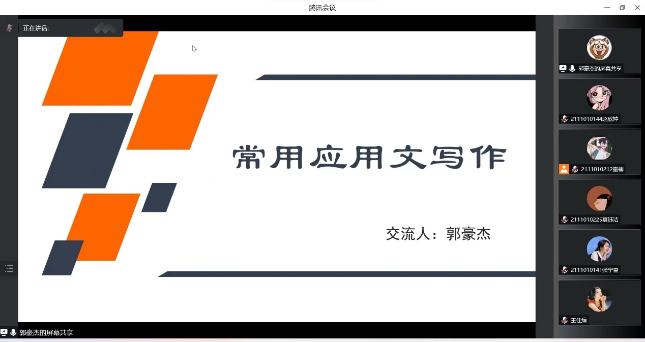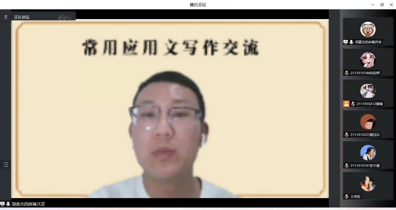 郭豪杰从应用文定义、应用文类型、校园新闻写作与应用文写作技巧四个方面介绍了应用文写作的相关内容,并按应用文体分类对新闻稿、感谢信和会议记录等文体的写作要求进行了逐一讲解。他着重分析了各种应用文文体间的异同,指出不同文体的特点及所对应的要求,并结合相关示例进行深入细致的分析。在介绍竞赛类新闻稿件时,他以山西师大学子地球日举办“变废为宝”创意设计大赛为例,引领同学们深入剖析、打开视野,详细地介绍了该类文体写作的格式、标题及正文部分的写法。会议最后,郭豪杰对本次会议进行了总结,强调了应用文写作的重要性并针对同学们提出的问题进行了解答。