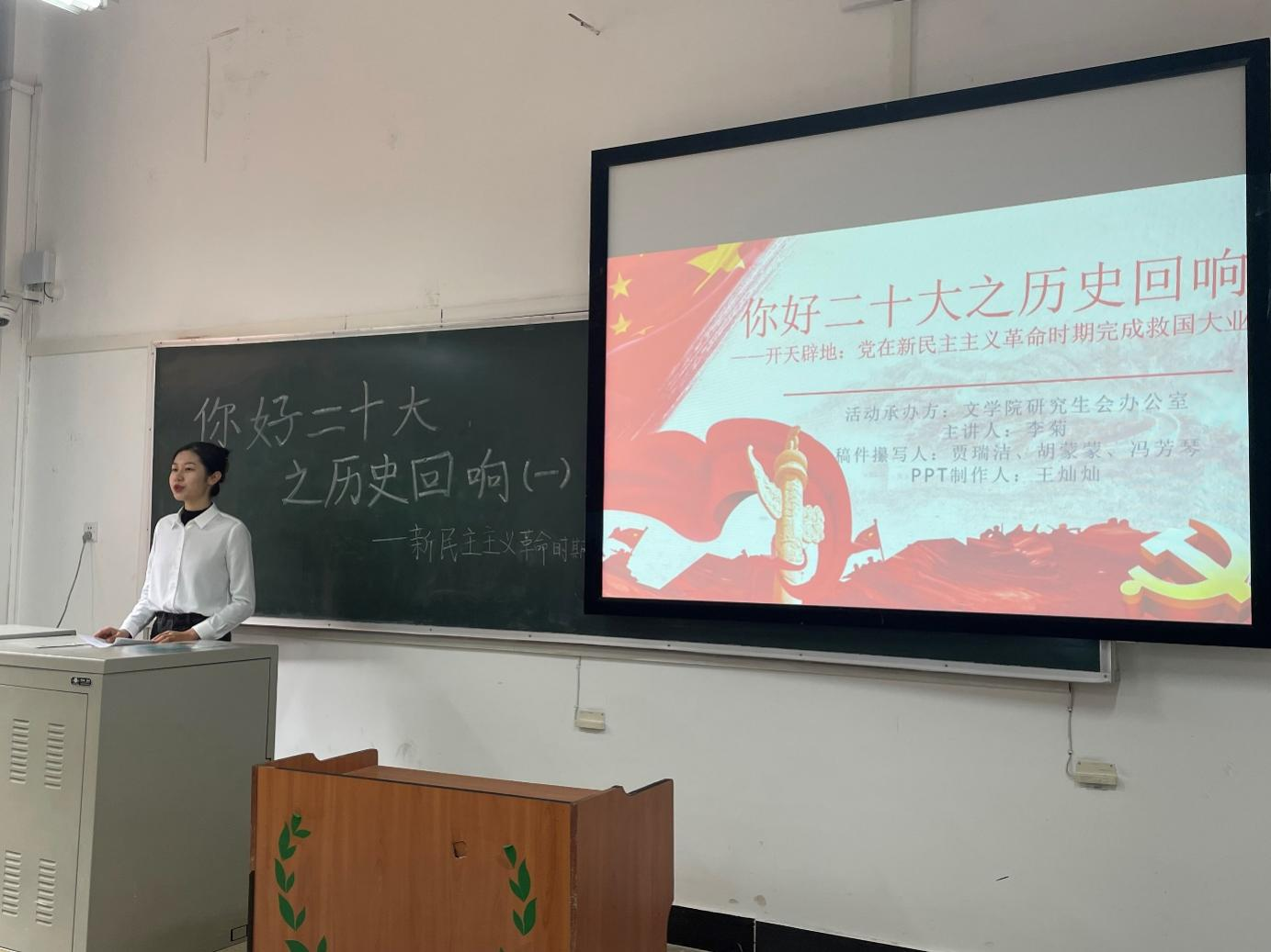 11月4日上午,best365官网研究生会在3号教学楼102教室举办了党的新民主主义革命史宣讲活动。本次活动是“你好二十大之历史回响”系列活动的第一部分,由研究生会办公室成员王灿灿主持,30余名best365官网研究生共同参加。