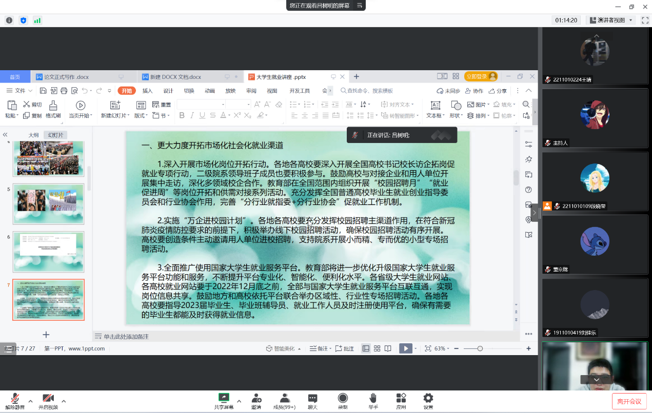 会议伊始,吕树明老师带领大家详细解读了教育部发布的《关于做好2023届全国普通高校毕业生就业创业工作的通知》,他强调当前疫情形势严峻,就业情况不容乐观,同学们一定要确立正确就业观念,不断提高自身综合实力。他以2020届和2021届毕业生毕业去向为切入点向同学们讲解了best365官网就业形势,让同学们更加清晰地了解就业形势,并就如何树立正确的择业观提出相关建议。最后,吕老师指出同学们要对就业大环境有清晰的认知和理解,正确认识自我、确立职业理想、科学规划职业,保持积极乐观的就业心态,转变陈旧的择业观念,结合社会的需要理性就业、勇敢创业。