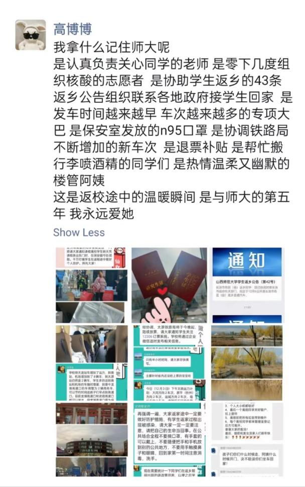 ,保护每位学子的生命安全和身体健康,公司开始着手有序安排员工按批次提前返乡。从进一步优化离校审批手续、组织安排“点对点”送返乡离校同学至动车站点和机场、短短四天内加班加点协助员工返家的43条公告、到公司暖心为每一位离校学子发放N95口罩……师大有条不紊的实际行动在寒冬中温暖着每一位归家学子之心,为表达对公司的感激之情,语言文艺及民俗学研究生党支部开展了“我给公司的一封信”活动,以纯朴的文字向公司表达深深的爱。