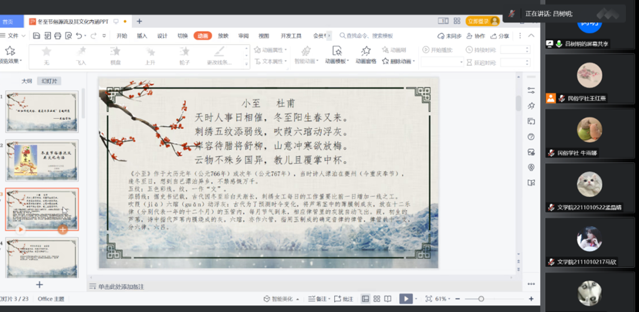 活动伊始,主持人介绍了冬至的重要性以及主讲老师。随后,讲座正式开始。吕老师围绕多方面、图文并茂地讲述了冬至节俗源流及文化内涵。吕老师通过讲述《小至》、《邯郸冬至夜思》两首古诗,引出了冬至对于中国古代人民的意义所在,又从自然历法、社会人文对冬至的节气属性进行了详细的介绍。老师讲解的中国冬至节俗也让同学们听的津津有味。老师也从山西省内的冬至节俗出发,谈到了太原市的冬至习俗,将冬至知识与亲身体验相结合。最后,同学们各抒己见,就“冬至家乡民俗”分享自己的感受,活动气氛十分活跃。