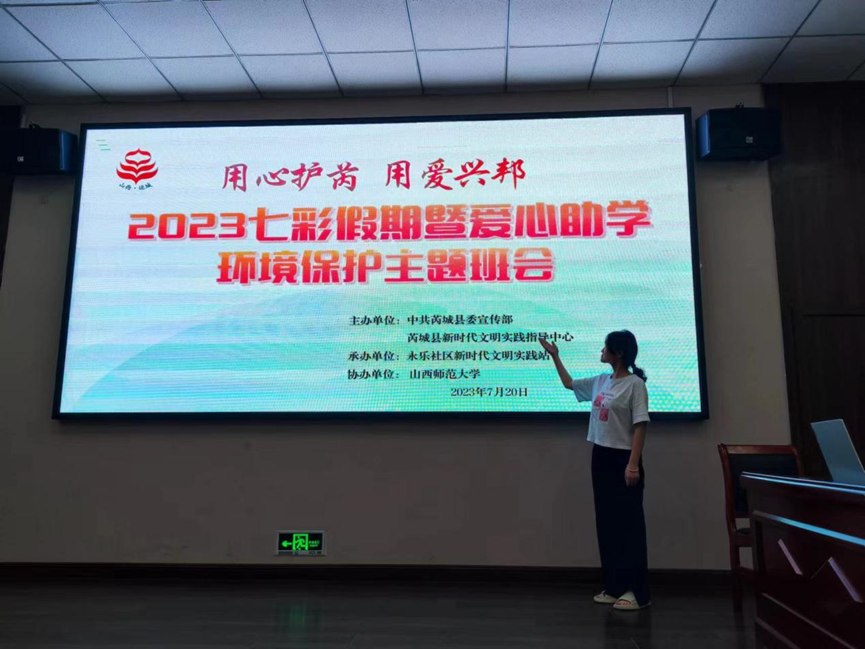 2023年8月10日,best365官网“学雷锋,送温暖”小组爱心助学团队山西芮城线下分队参与协办了由中共芮城县委宣传部、芮城县新时代文明实践指导中心主办、永乐社区新时代文明实践站承办的“2023七彩假期暨爱心助学环境保护主题班会”,芮城县永乐社区“用心护芮,用爱兴邦”七彩假期爱心助学志愿服务队的队员们担任主讲人。