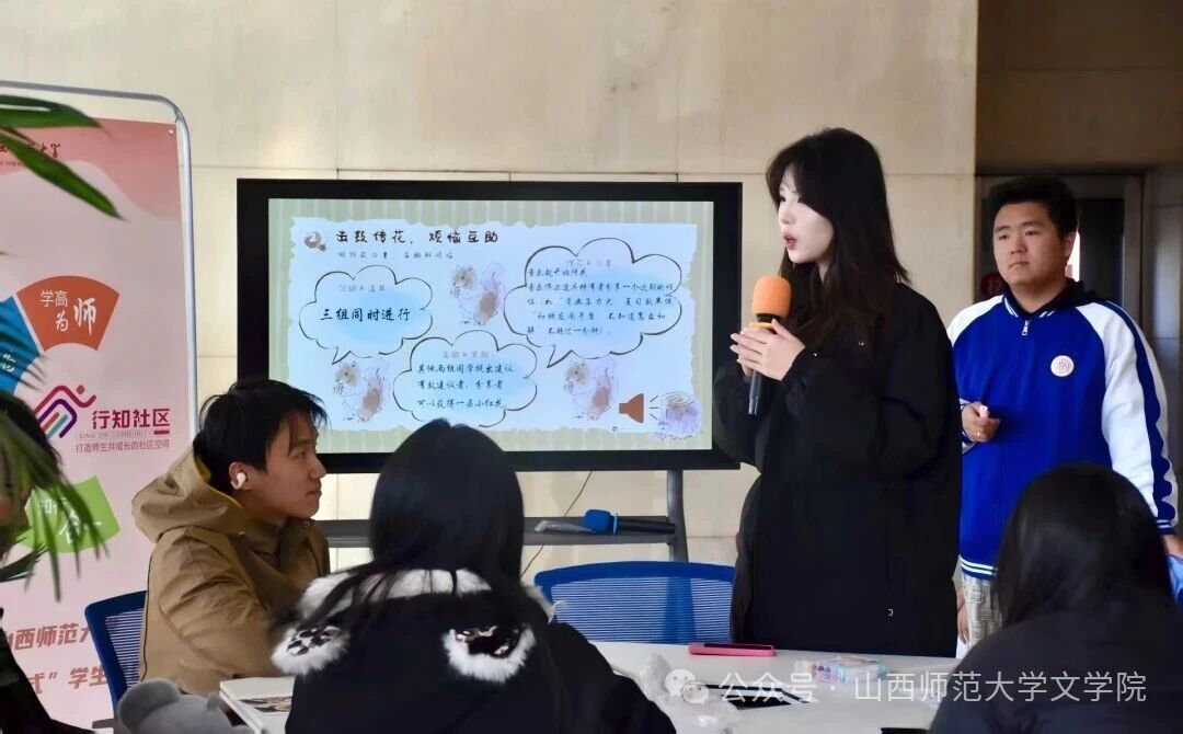 活动精心设计了多个趣味与疗愈巧妙结合的环节。“击鼓传花·烦恼互助”环节,同学们在音乐中分享近期烦恼,体验了倾诉与互助的力量。“听歌识曲”环节以欢快旋律迅速点燃现场气氛,增进了团队默契。核心疗愈部分“木桩绘心”与“便利贴寄语”中,同学们运用色彩与线条在天然木桩上自由表达情绪,并将当下的感受与期待写在彩纸上,共同构建起一面承载集体情绪的“寄语墙”。最后,各组将创作成果汇聚于“生命之树”进行分享,整个活动在积分颁奖与温馨合影中圆满落幕。本次活动是一次成功的跨学科协作实践,将美术表达、文学叙事与心理学知识转化为生动的体验,为营造温暖互助、关注心理健康的校园文化氛围贡献了积极力量。
