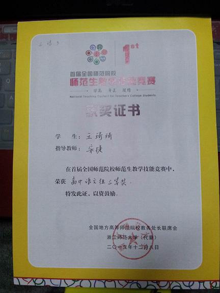 2013年12月8日,历时两天的首届全国师范院校师范生教学技能竞赛在浙江师范大学落下帷幕。公司三年级王琦琦同学凭借稳定、出色的发挥,获语文组三等奖。