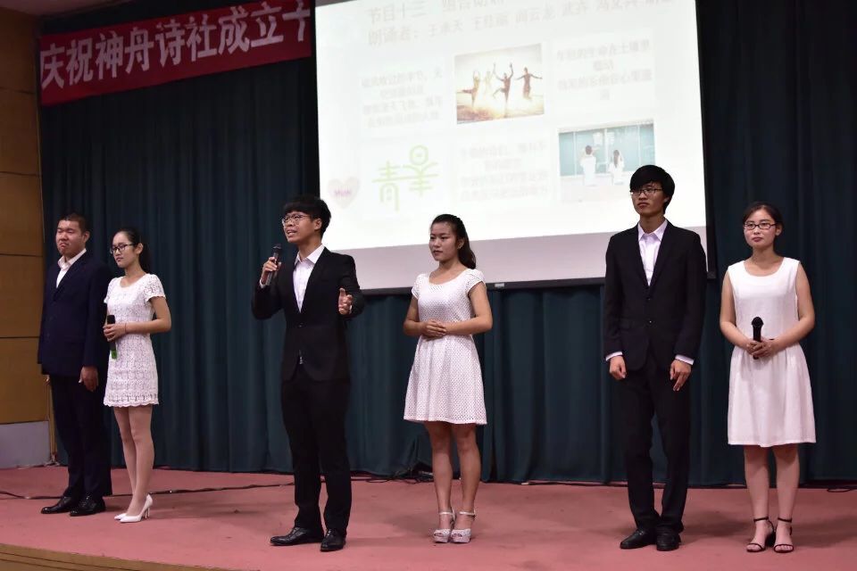 上午10时许,在身着红色汉服的六位舞蹈者的翩翩舞姿中,神舟诗社十周年庆典拉开了帷幕,一曲《青青子衿》,跳出了诗社的厚重,也拨动了在场所有人的心弦。接着,王承天和王珺的向舒婷致敬——《祖国啊我亲爱的祖国》、《致橡树》朗诵,赵临星的《乡愁四韵》吉他弹唱,杨思琦的《瑶族舞曲》古筝弹奏,毋凡,翟慧贤的《唐诗里的中国》吟诵,把活动逐步地推向高潮。在诗歌知识提问环节,现场观众踊跃抢答,表现出了极大的热情,一个个快速准确的回答,使得现场气氛更加热烈。互动环节之后,郝琛学长栩栩如生的《将进酒》、裴鹏程学长荡气回肠的《商鞅之死》朗诵表演,将所诵读的人物诠释得淋漓尽致,赢得在场观众的阵阵掌声。赵霞的演唱《但愿人长久》,汪楠的钢琴弹唱《红豆》,则让观众陷入清灵动听的歌声中久久不能自拔。在本次活动中,尤其令人眼前一亮的便是方言朗诵表演,独具特色的多种方言演绎字字珠玑的诗文,真正做到了雅俗共赏,让人忍俊不禁又不得不拍手称赞。更有往届诗社社长和主编送来的祝福视频,回忆往昔展望未来,令人回味无穷。最后,本次庆典在六人联合朗诵声中缓缓地落下了帷幕。