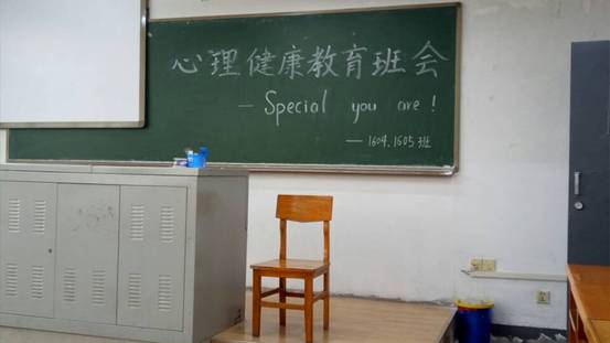 (图为1603班心理健康教育班会,班长张淋在台上讲话。)