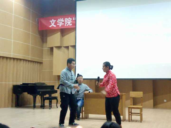 接下来的互动环节——看图猜成语,则让现场的观众一下子活跃起来,几位观众反应灵敏,快速揭开了谜底,赢得了观众的掌声称赞。在由段光辉和张峰宁带来的相声《你针对我》之后,歌曲串烧三人同台的幸福传递、肚皮舞《happy》所带来的热情活力,依次将现场的氛围不断升华。小品《药方》让我们在欢笑之余,也真切地感受到了抗战时期国人的爱国与坚守。整场晚会中最具创意的部分,莫过于光影秀《初遇》的展示了:十几位同学以独特的表现形式,再现了大一新生入学以来的种种经历与感受,赢得了新同学们一致的共鸣与感慨。晚会以贾祎航的一首歌曲《家人》作结,她空灵的歌声将现场观众的思绪引向了故乡和亲人,歌声传达欢庆,传达祝福,更传达了师生内心深处的思念与回忆。