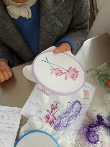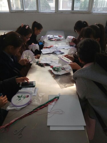 2月26日上午9点到11点是属于香囊组同学们的,他们根据自己的想象将不同颜色的彩线搭配在一起,再加上彩珠的点缀,一个个具有特色的香囊便出炉了。缠绕的彩线,有趣的创意,新奇的搭配使本次香囊活动更具吸引力。下午2点到5点进行的是刺绣活动,这是本次活动最后一站,却也是最热闹的,同学们人手一个绷框,低头认真刺绣。纤细的手指,伴着针线的飞舞,一幅幅美丽的手工刺绣作品便完成了,同时在指尖缠绕的,是我们博大精深的刺绣文化。