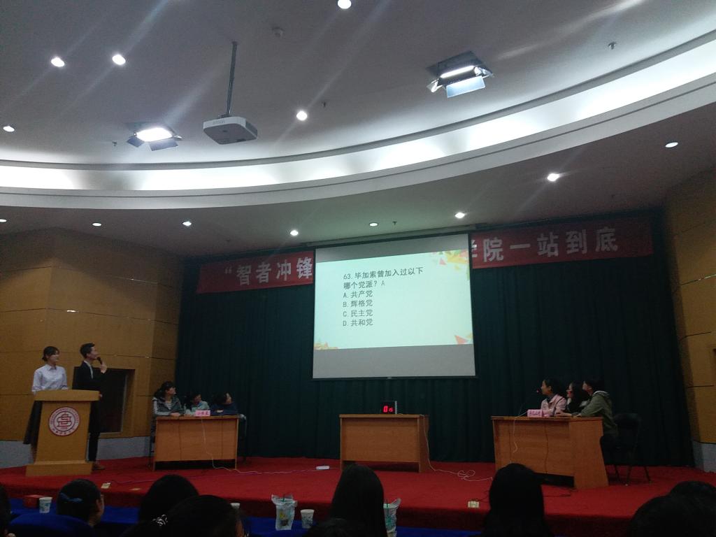在决赛的第一个环节——“‘智’在必得”中,参赛选手逐渐进入状态,在八组队员的两两对决中,场面一度进入白热化阶段,选手接连得分更是赢得了台下观众的热烈掌声。涉及到的各类题目,或难或易,各组队员之间争相抢答,团队观念,进取精神在比赛中展现的淋漓尽致。