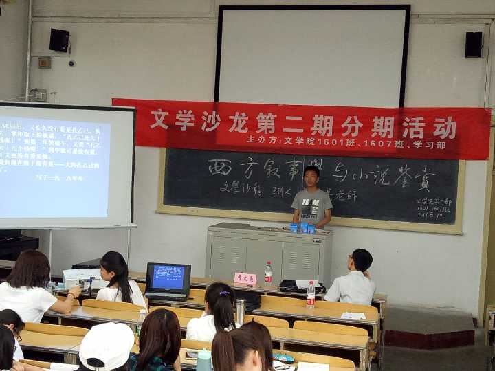 5月14日下午,由公司员工会学习部主办,1601、1607班承办的文学沙龙第二期分期活动——西方叙事学与小说鉴赏,在05203教室成功举办。此次活动的主讲是曹文亮老师,1601、1607班全体同学参加了本次活动。