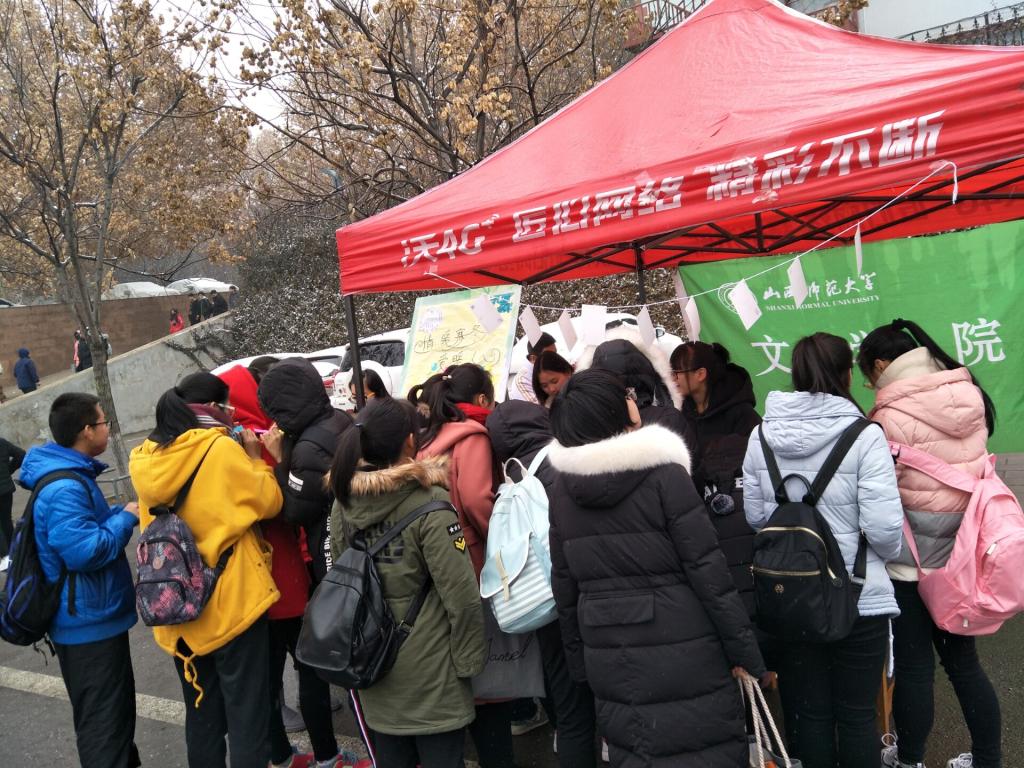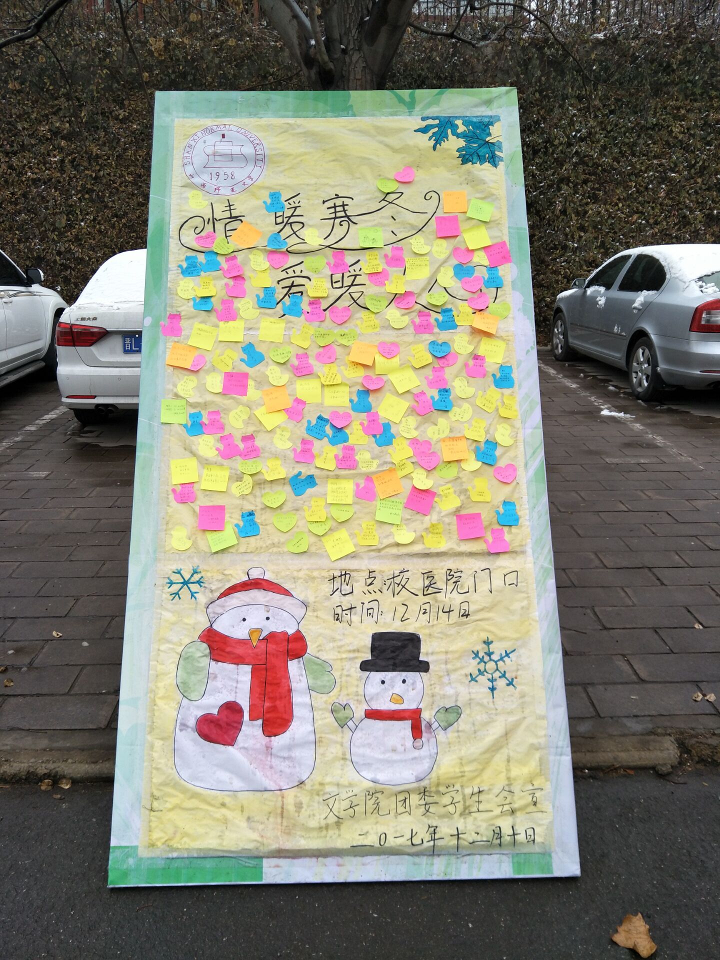 伴随着2017年第一场雪,暖冬活动正式开始。同学们在初雪之时写下对自己、亲人、朋友们充满爱意的祝福。很快,承载着满满暖意的祝福小纸条便贴满了整个活动展板。其中,有对朋友、亲人“快乐幸福,天天开心”的祝愿,也有对陌生人“冬季注意保暖”的暖心祝福……这个冬日,初雪飘落,虽然寒冷,却有一股暖流流淌在每一个人的心间。