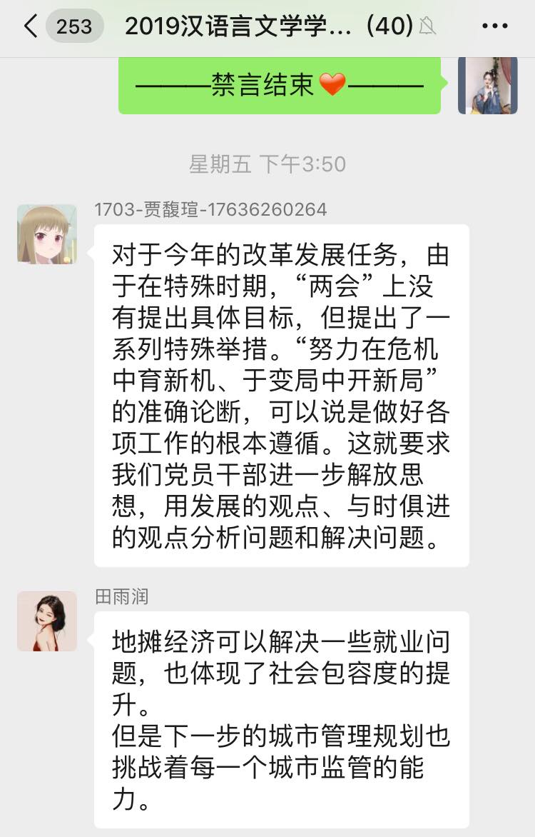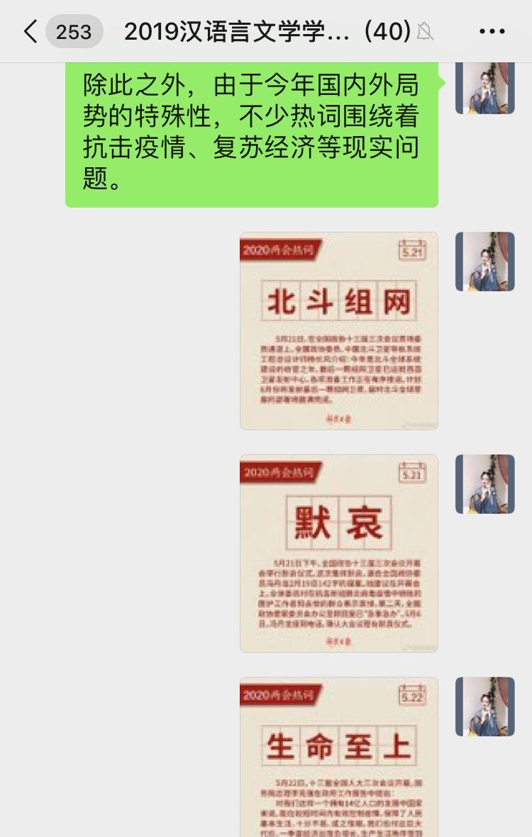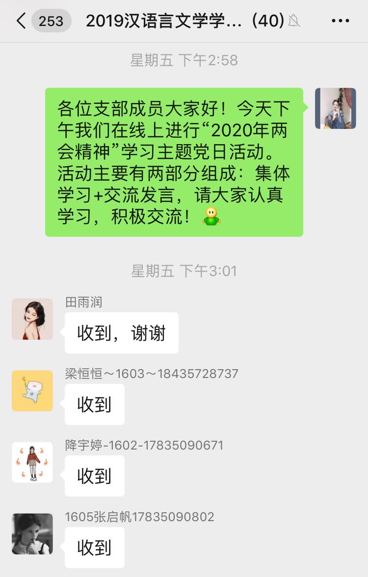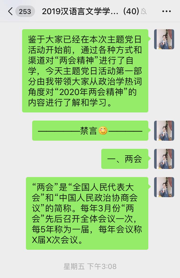 6月5日下午,best365官网汉语言文学员工党支部开展学习“2020年两会精神”线上专题党日活动,支部全体党员参加本次会议,会议由支部书记侯昕昊主持。