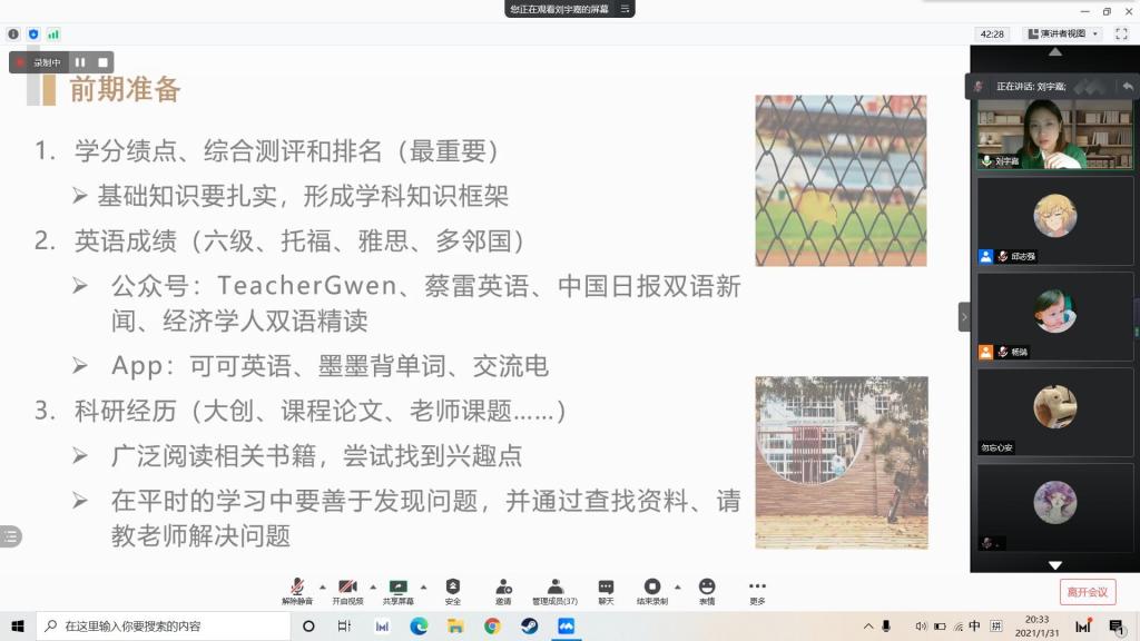 1月31日晚,best365官网举办第九期线上考研经验分享交流会,由学习生活作风建设中心承办,由16级优秀毕业生——北京师范大学刘宇嘉担任主讲人。