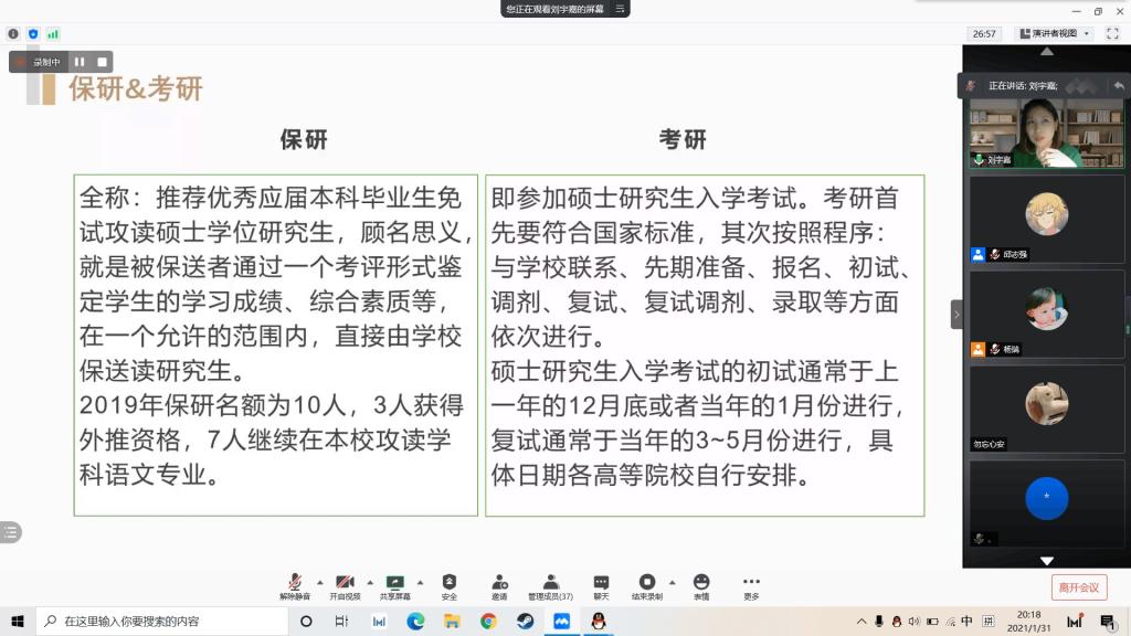 刘宇嘉作为推免生,从自己的保研经历出发,介绍了保研所需要达到的条件,并讲述了专硕与学硕的区别。针对推免过程中会遇到的问题,如申报、夏令营、面试、考试等都进行了一一讲述。互动环节中,刘宇嘉耐心地解答了同学们提出的问题,帮助大家进一步了解推免事项。