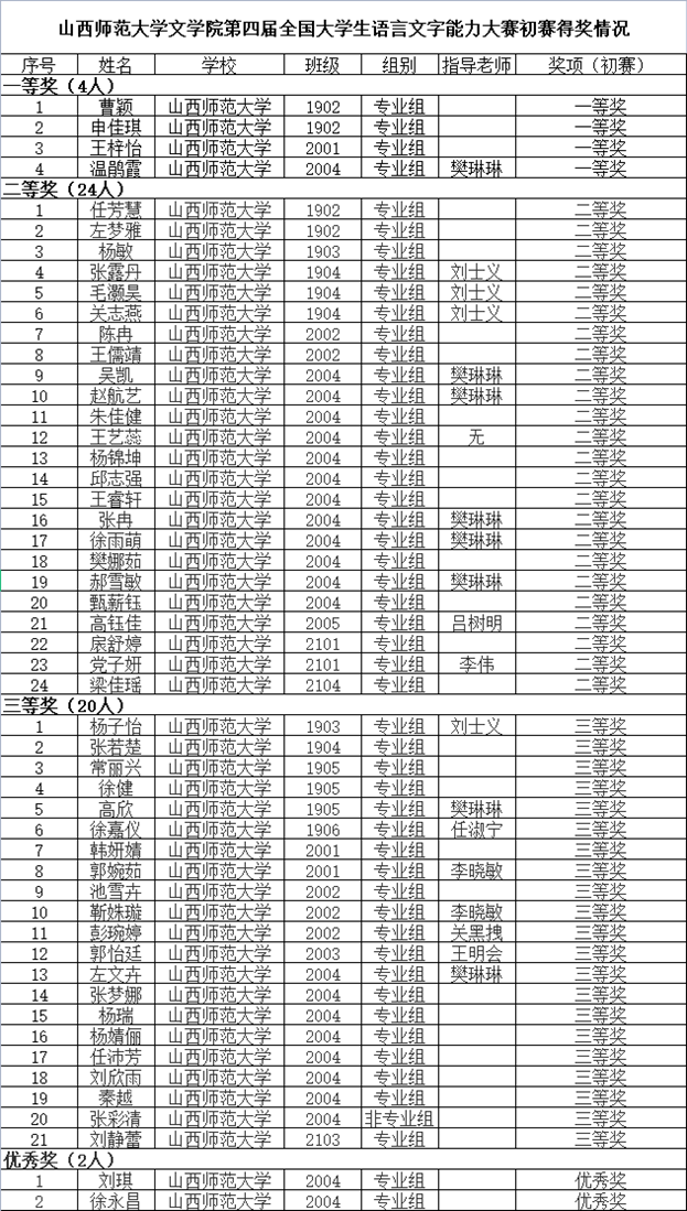 6月23日,第四届全国老员工语言文字能力大赛初赛结果揭晓,best365官网学子在此次比赛中共51人获奖,其中一等奖4人,二等奖24人,三等奖21人,优秀奖2人。