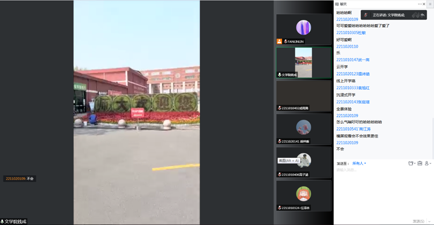 主题教育环节结束后,为让大家可以更好地熟悉校园环境,钱书记亲自带领22级新生进行线上云游校园,22级新生跟随视频镜头,参观师大的一草一木。从best365官网办公室出发,沿师大中轴线观光,他分别为大家介绍了图书馆、思政文化街、餐厅、毓秀湖及主要教学楼等校园地点,大家狂刷弹幕:“书记好可爱”“沉浸式开学”“老师慢点走”“公司是不是有郁金香”“想看猫学长”“这个湖里是不是可以钓鱼”……在整个直播的过程中,发问不断,解疑不止,气氛活跃。