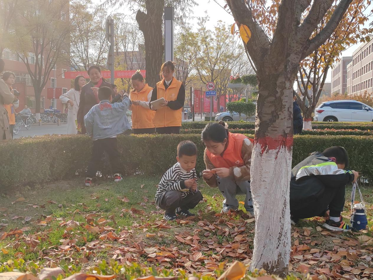 图为小朋友们在捡落叶