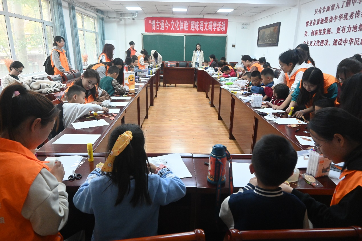 在本次研学活动中,鲁立智向小朋友们讲解了《九月九日忆山东兄弟》的内涵,并带领他们在校园里寻找自己心仪的树叶、写下对生活美好的期许。随后,在志愿者的组织下,小朋友们有序到达院会议室,通过观看视频、志愿者指导等方式学习制作树叶卡片,将对秋天的美好愿望寄托在卡片上,创作出属于自己的作品。最后,小朋友们将自己的作品进行集体展示,在一片欢声笑语中活动圆满落下帷幕。