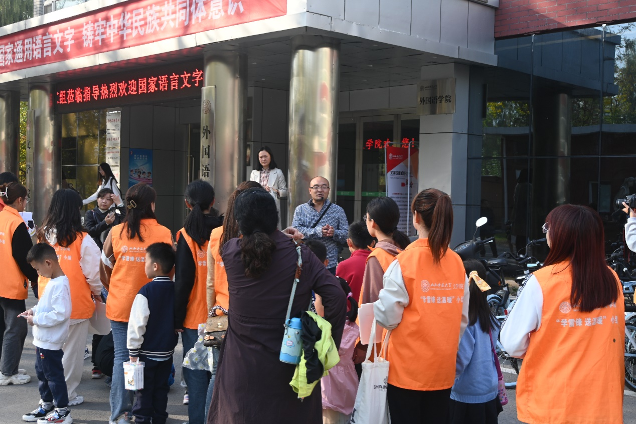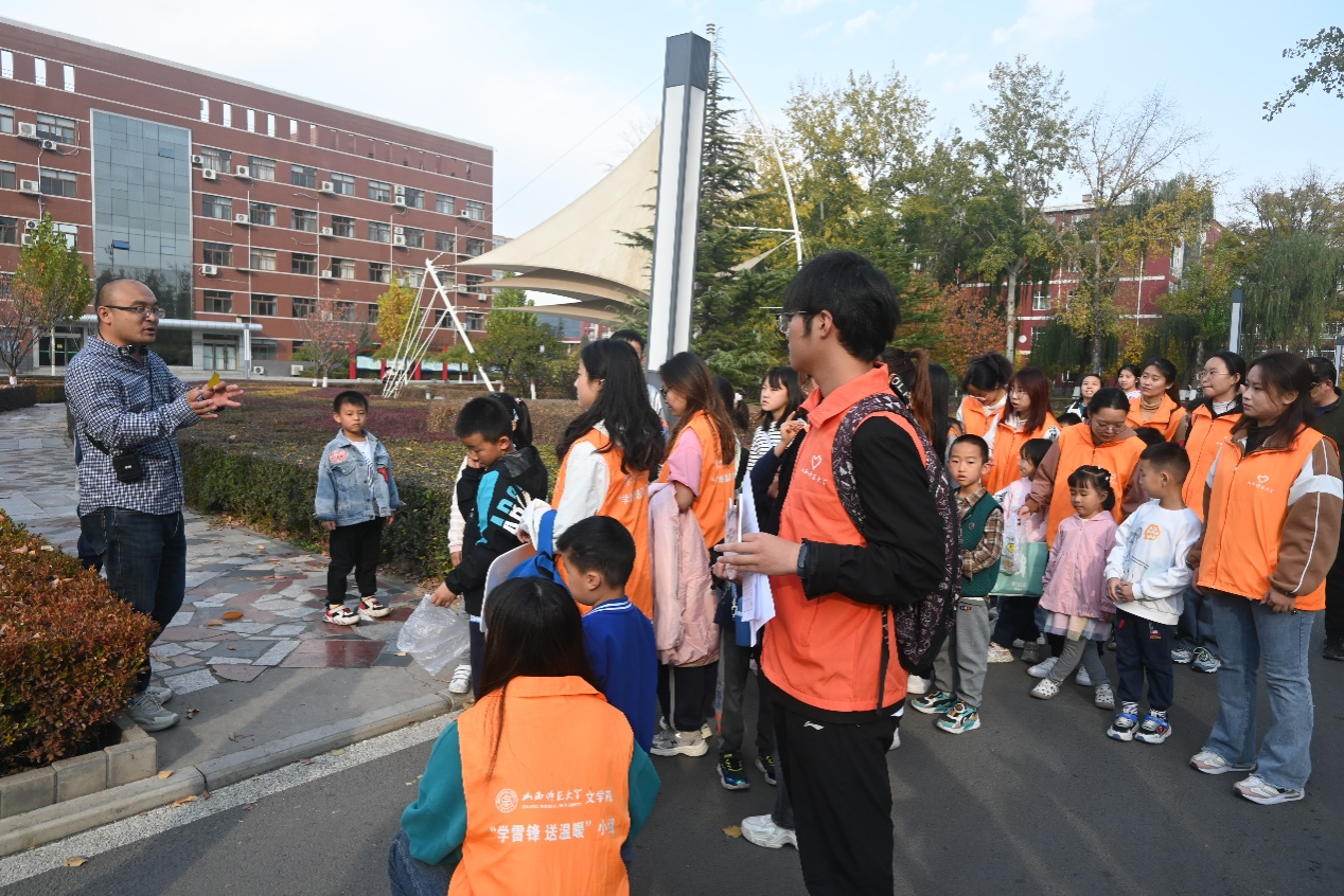 图为鲁老师在游园过程中讲解知识