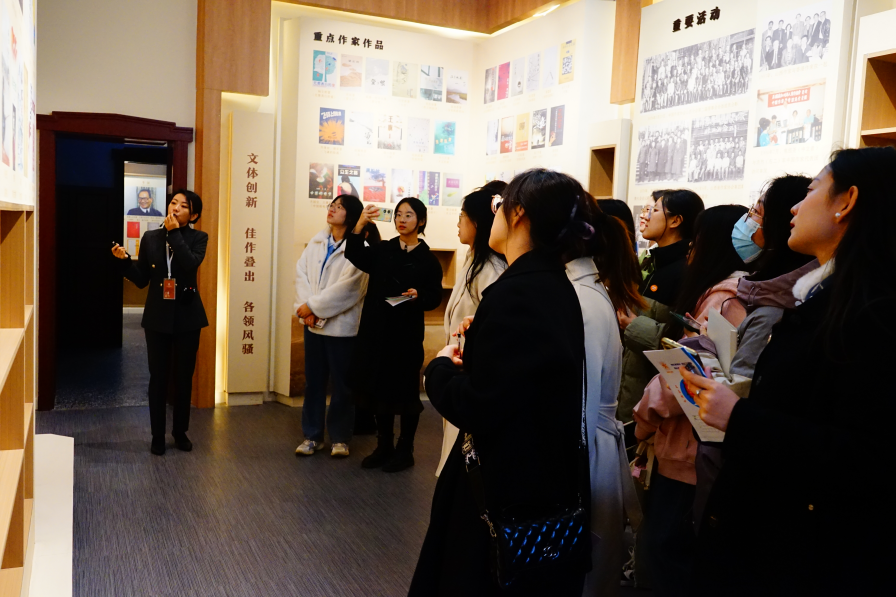 首先,同学们参观了“山西现当代文学展馆”。讲解员贺旖璇带领大家以图片展示的方式,重温了拥有百余年历史的山西现当代文学整体发展历程。讲解过程中,既有文学史脉络的总体梳理,也有代表性作家作品的重点介绍。同学们认真聆听、详细记录,充分认识了山西现当代文学在中国文学发展史上的重要地位和意义。
