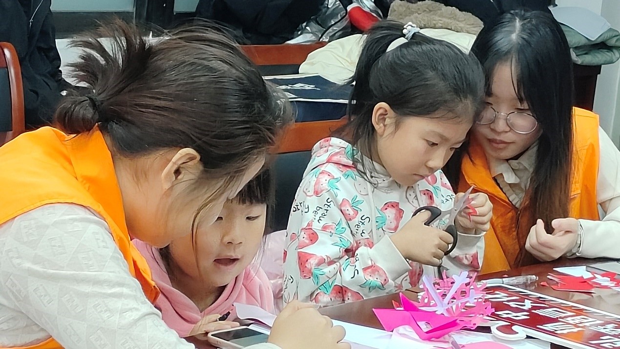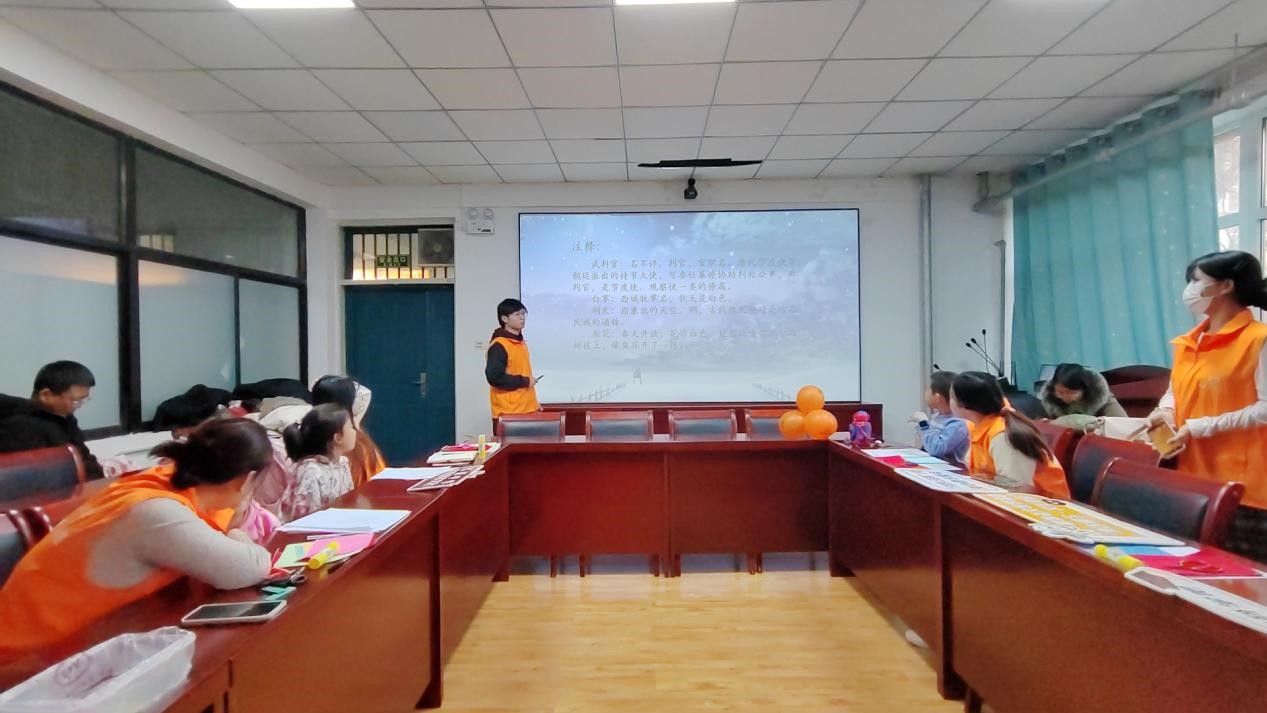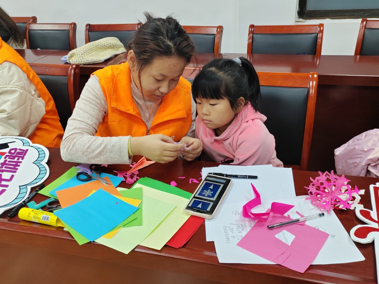 活动现场,气氛热烈而和谐。志愿者向小朋友们展示了有关“雪”的诗词——《逢雪宿芙蓉山主人》和《江雪》,重点讲解了《白雪歌送武判官归京》(节选)。在志愿者的带领下,小朋友们一起朗读诗句、翻译诗句,充分理解诗歌的内容。在诗词讲解之后,活动进行到下一环节——剪纸。小朋友们在志愿者的引导下,开始动手将心中对“雪”的理解和想象用剪纸这一传统艺术形式展现出来。他们认真地折叠、绘画、剪裁,剪出形态各异的雪花。