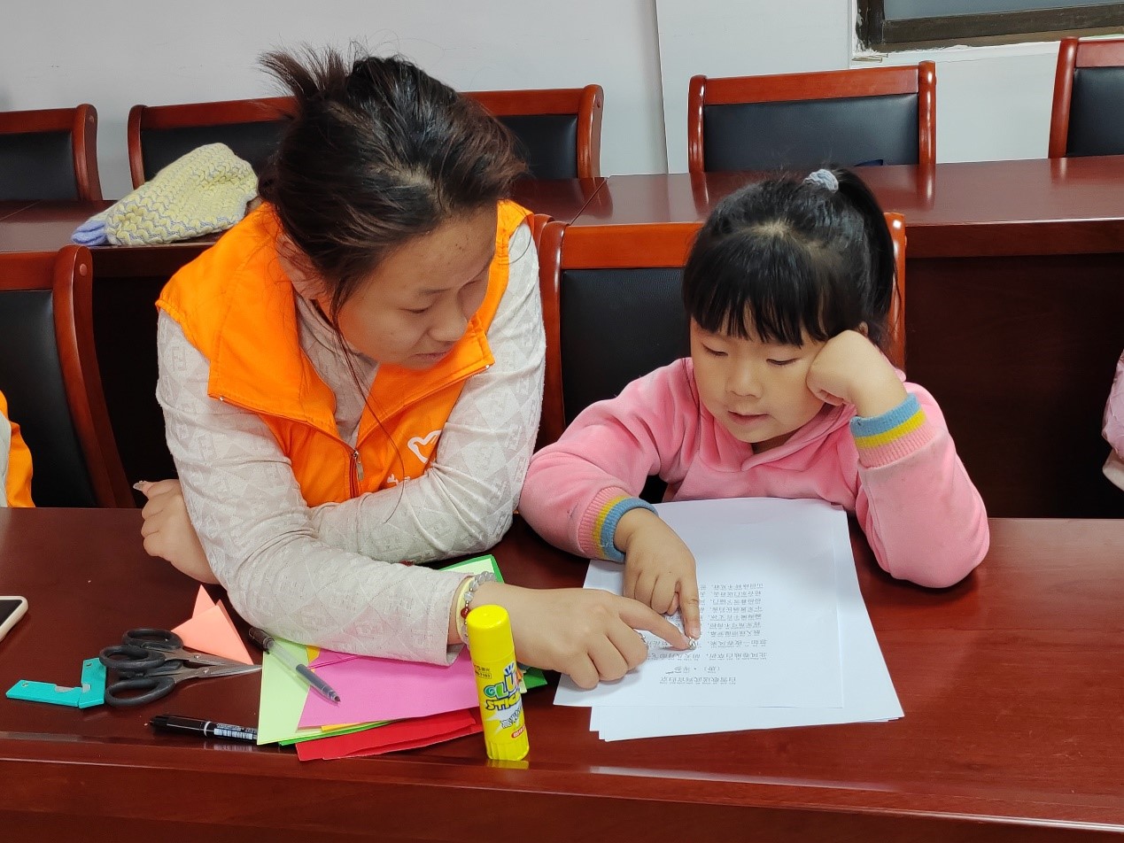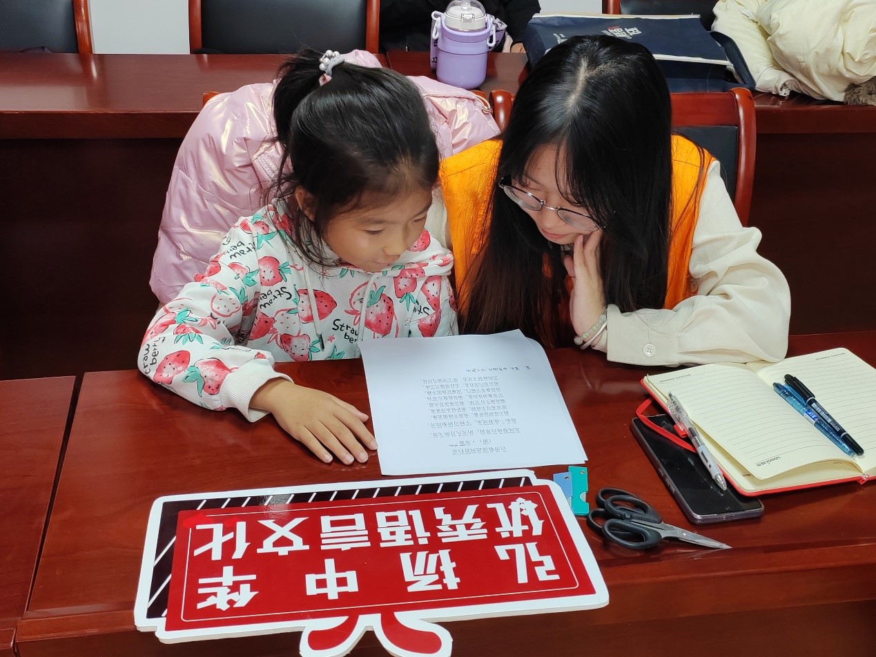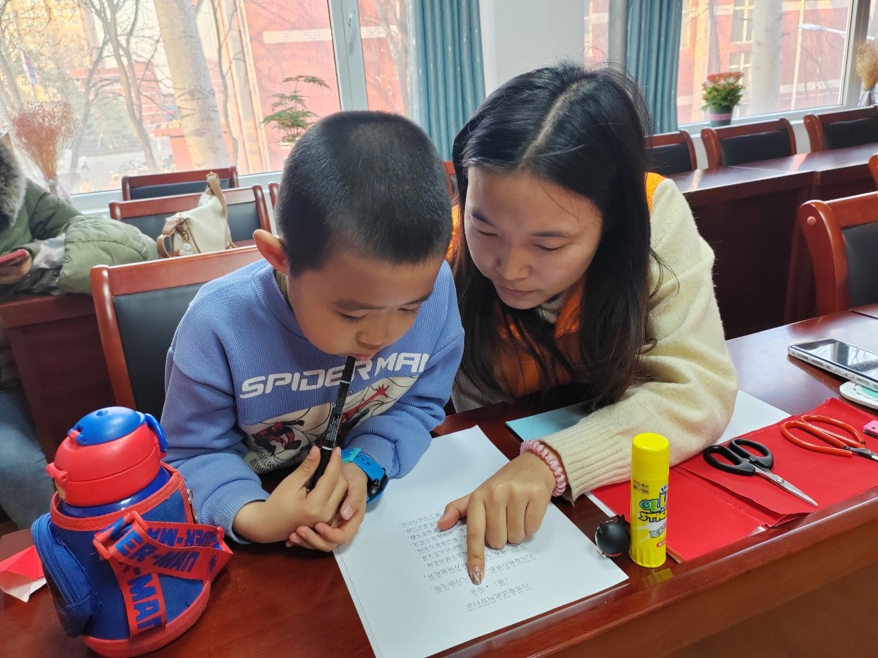 活动现场,气氛热烈而和谐。志愿者向小朋友们展示了有关“雪”的诗词——《逢雪宿芙蓉山主人》和《江雪》,重点讲解了《白雪歌送武判官归京》(节选)。在志愿者的带领下,小朋友们一起朗读诗句、翻译诗句,充分理解诗歌的内容。在诗词讲解之后,活动进行到下一环节——剪纸。小朋友们在志愿者的引导下,开始动手将心中对“雪”的理解和想象用剪纸这一传统艺术形式展现出来。他们认真地折叠、绘画、剪裁,剪出形态各异的雪花。