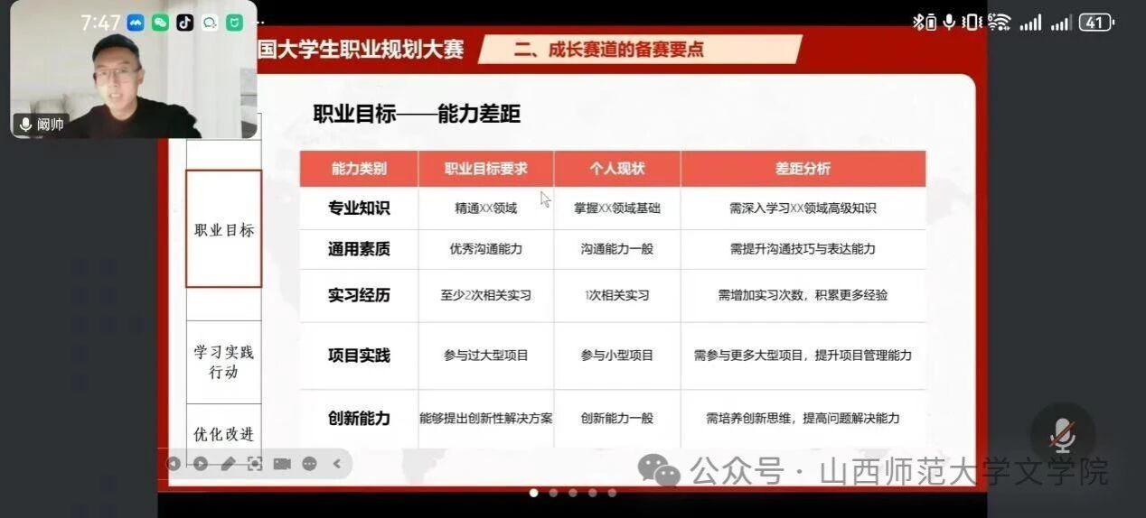 分享会上,阚帅聚焦不同赛道的备赛要点展开讲解,重点拆解了指导不同阶段员工备赛的核心方法。他通过表格清晰地呈现了职业目标对专业知识、通用素质和实习经历等能力类别的具体要求,结合“个人现状”与“差距分析”的对应关系,直观展示了如何更加贴合赛事评分标准,以及如何精准提高员工能力、弥补短板。此外,他结合自身指导员工斩获国赛金银奖的经验,点明职业规划要根据目标确定合理的能力提升路径,建议指导教师从不同维度帮助员工构建清晰的成长框架,培养员工的创新思维。