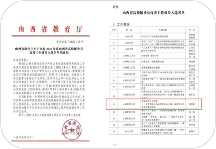 2020年7月,其工作案例入选2020年度山西省高校辅导员优秀工作成果。