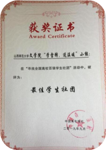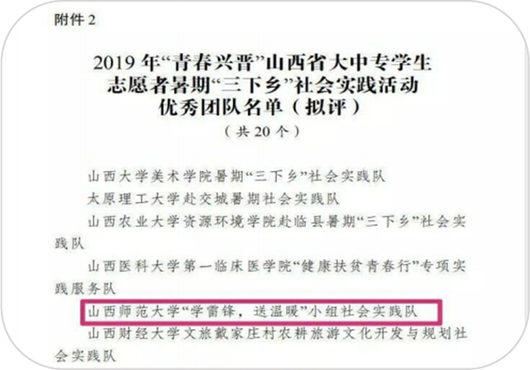 2019年12月,“学雷锋,送温暖”小组社会实践队被共青团山西省委评为“青春兴晋”山西省大中专员工志愿者暑期“三下乡”社会实践活动优秀团队。