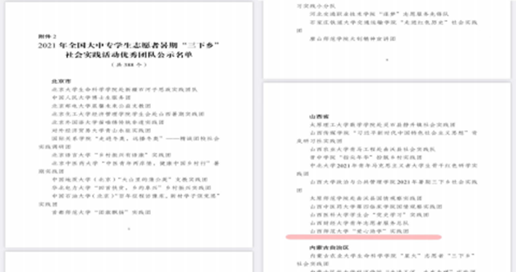 2021年10月,”学雷锋,送温暖“小组线上”爱心助学“志愿服务项目被评为2021年山西省大中专员工暑假文化科技卫生”三下乡“社会时间活动”示范项目“。