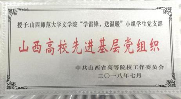 2018年7月,“学雷锋,送温暖”小组员工党支部被山西省高等院校工作委员会评为“山西高校先进基层党组织”荣誉称号。